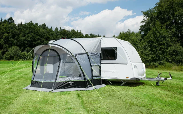Vorderwand mit 50% Moskitoanteil (von außen abdeckbar), seitlich wegrollbar. Hintere Seitenfenster mit Moskitogaze und Abdeckklappe außen. Restliche Fenster von innen blickdicht verschließbar. Zusätzlicher seitlicher Eingang rechts. 2 fest angenähte Schaumstoffwulste zur optimalen Anbringung am Wohnwagen. Praktischer Organizer im Zeltinneren.