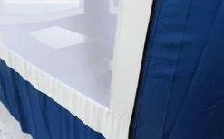 - Zelthaut im Packsack (100 % Polyester), Abspannmaterial, Windblende (100 % Polyester, beidseitig Polychlorid-beschichtet) und Gardinen (50 % Baumwolle / 50 % Polyester).