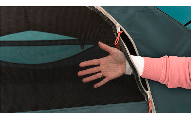 Das Easy Camp Edendale 400 bietet Platz für bis zu vier Camper und ist ein ideales Tunnelzelt für junge Familien. Es lässt sich schnell und einfach aufstellen, und die Fiberglasstangen sorgen für ein leichtes Zelt, das sich beim Wegpacken einfach handhaben lässt. Der Zugang erfolgt einfach über die Vordertür, die durch ein ordentliches Vordach vor den Elementen geschützt ist. Der abgedunkelte Sleep-Tight-Schlafraum schirmt das Licht von außen ab und sorgt so für einen erholsamen Nachtschlaf. Der Wohnbereich mit voller Stehhöhe bietet mit seinen Fenstern an der Vorder- und Seite reichlich Platz zum Entspannen. Mit den flexiblen Belüftungsoptionen können Sie die Luftzirkulation je nach Bedarf einstellen.