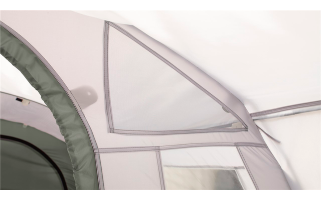 Zahlreiche Merkmale machen diesen geschlossenen Vorraum besonders praktisch: Stehhöhe, fünf Fenster mit Vorhängen, eine Doppeltür an der Rückseite und eine Vordertür, große Lüftungsöffnungen sowie ein aufrollbarer Zeltboden, der die gesamte Innenfläche bedeckt. Als optionales Zubehör ist ein Innenzelt für zwei Personen erhältlich, das beliebig an den Zeltseiten angebracht werden kann.