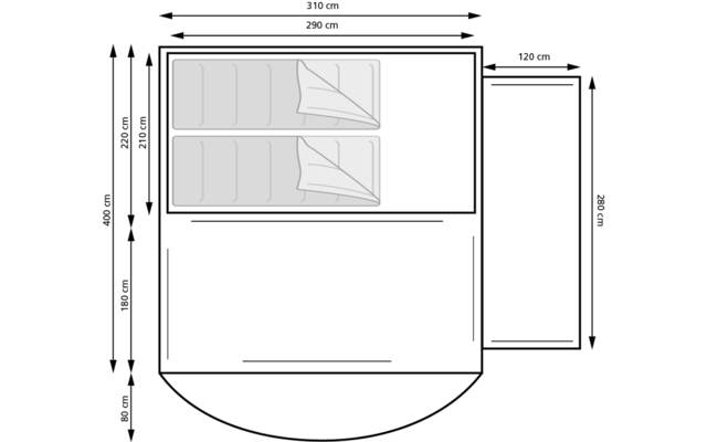 Das Zelt hat einen großen Wohnbereich mit fester Bodenplane und kommt mit einem 2 Personen Innenzelt von 140x190cm.