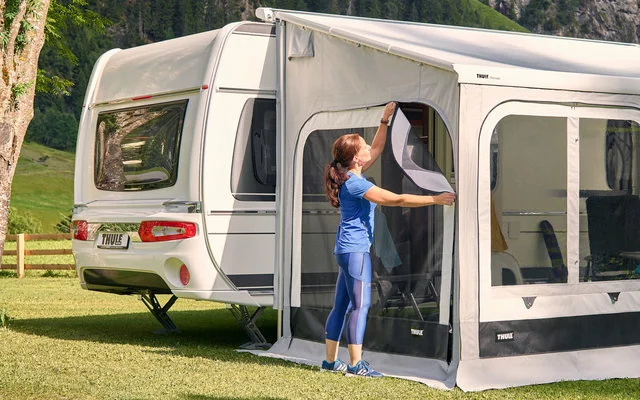 Zusatzpanel mit Reißverschluss, um die Standard Seite des Thule Panorama Zeltes zu ersetzen. Hergestellt aus Moskitonetz, um für zusätzliche Belüftung zu sorgen.